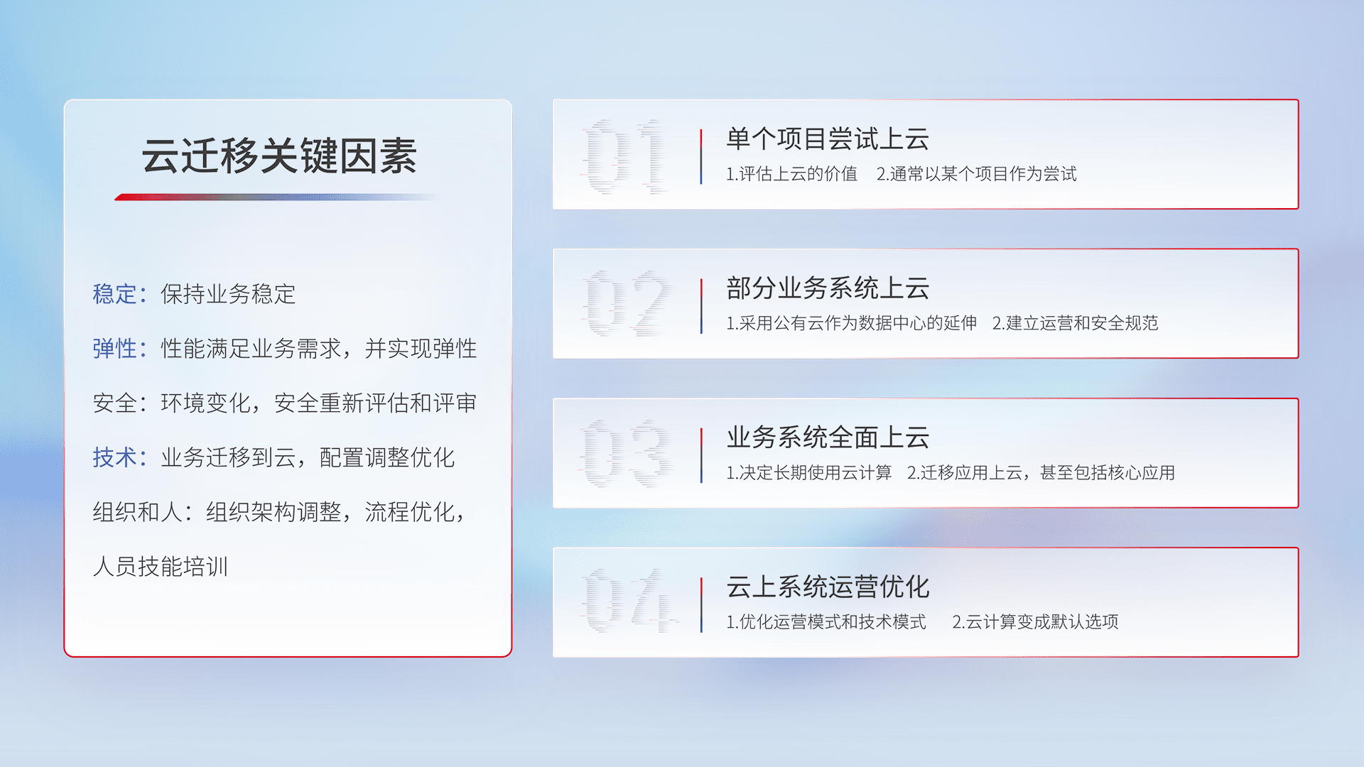 结合实际业务,,,从规划设计、、云平台选型、、、云原生改造、、数据迁移、、集成交付,,迁移全过程为客户识别最佳上云路径,,,做好风险识别管理,,,,设计网络架构、、身份权限、、、、安全审计合规、、、操作审计、、、、日志审计、、监控告警策略、、、多站点容灾设计等,,,对云上基础设施进行整体规划,,提升IT治理水平,,,以满足弹性、、高可用、、高性能的需求。。。