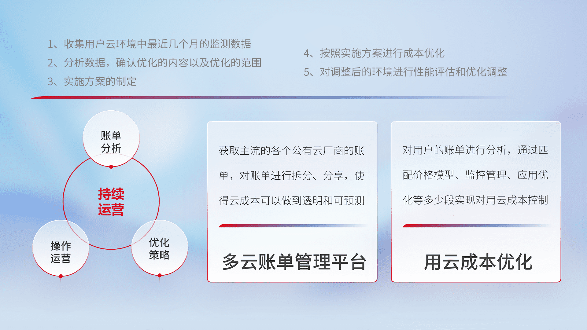 通过多云纳管,,以统一的资源数据模型把客户的云资源进行抽象和封装,,,,进而实现对多云资源的统一操作,,保障云资源管理的可靠性、、稳定性与可用性。。量身定制化运维内容,,配置、、、、开发运维、、补丁管理、、备份、、、监控、、、、认证和访问管理、、审计和日常巡检等,,保障在用云过程中的可靠度,,稳定度以及高可用率。。。